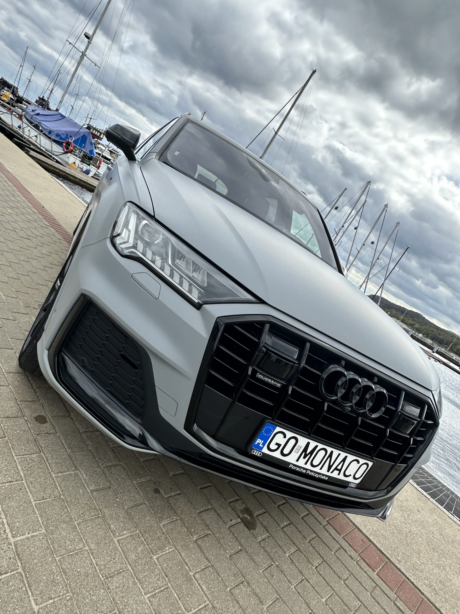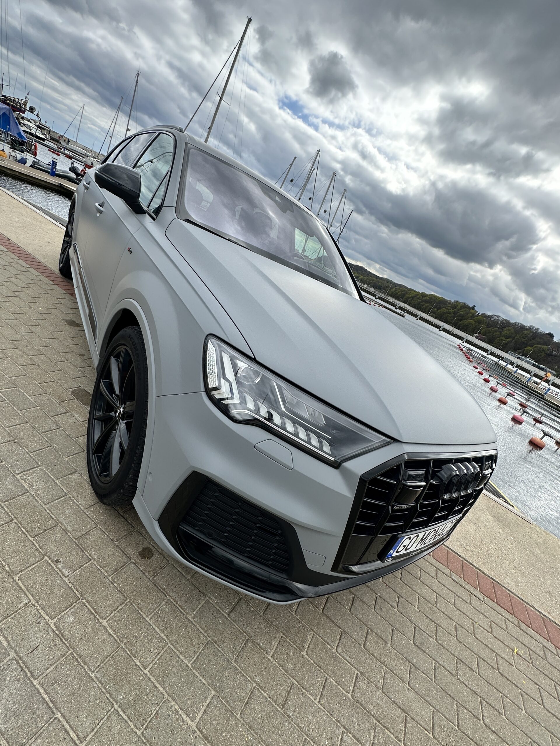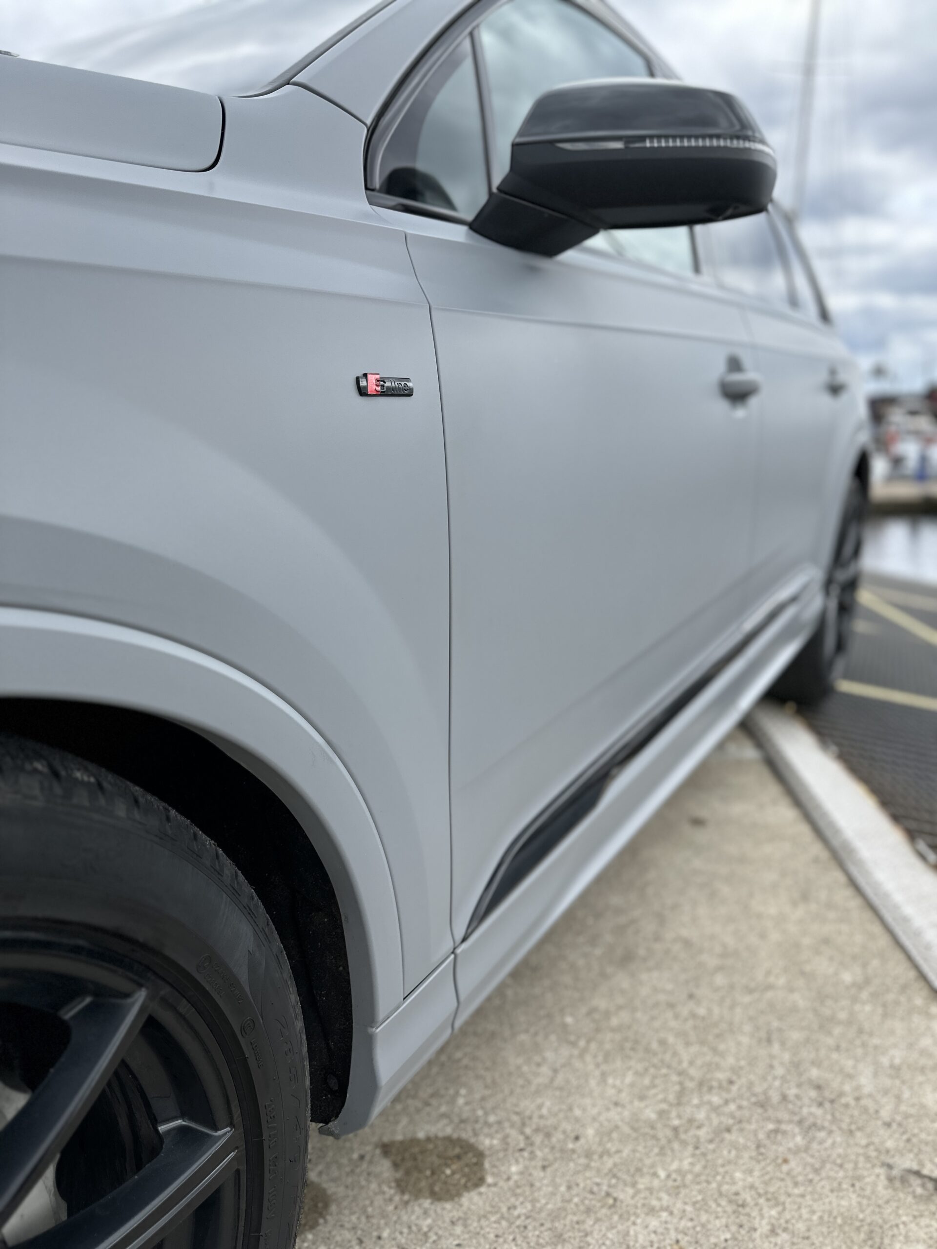 Fantastyczna przemiana – Audi Q7 oklejone w kolorze Avery Matte Dark Grey! Dodatkowo wymiana emblematów na czarne, pełen dechroming na czarny połysk, oklejenie felg, folia PPF na reflektory oraz ekrany i piano wewnątrz auta.