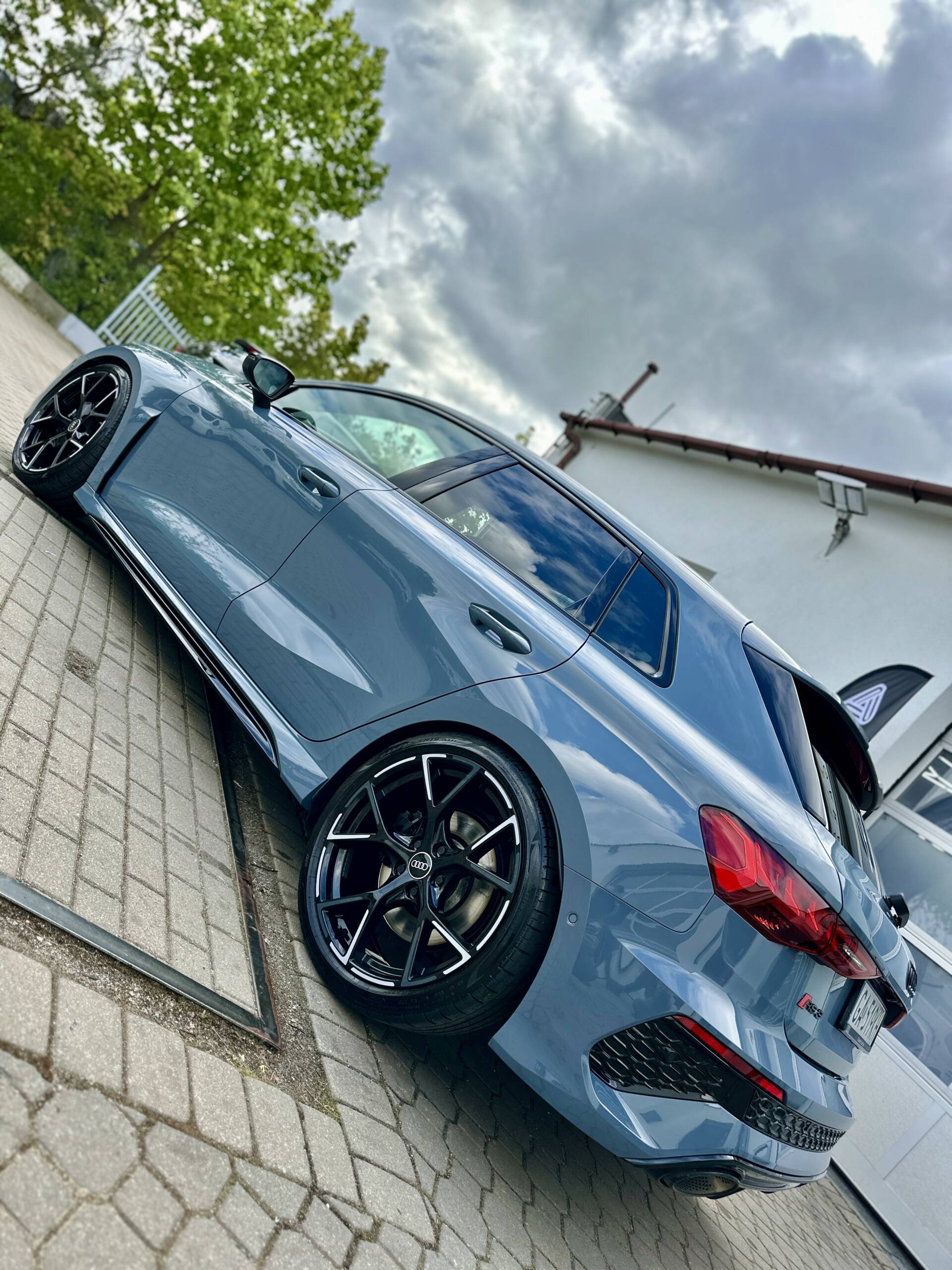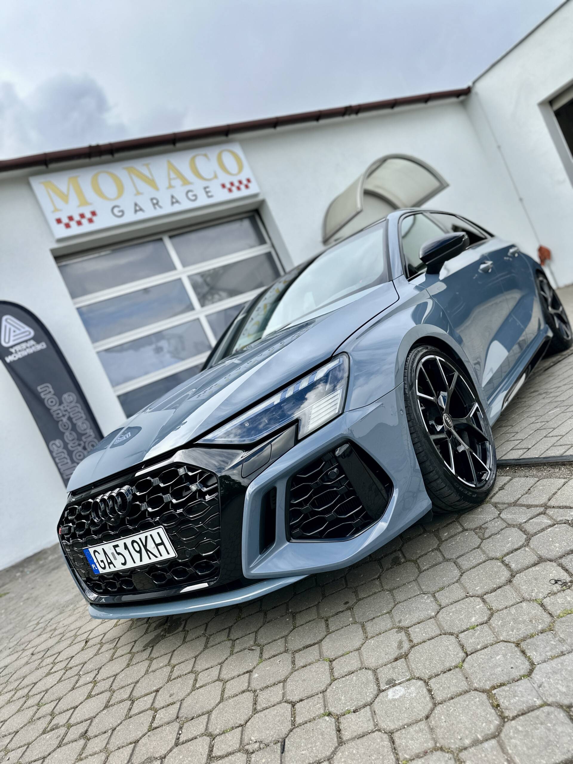 Audi RS3 zajęliśmy się od zewnątrz i w środku – Alcantara na kierownicy odzyskała swoje przyjemne w dotyku właściwości, wytarte skóry zostały odnowione i pomalowane, przednia szyba pokryta twardą, pancerną folią ExoShield na koniec zabezpieczenie lakieru w kolorze Kemora Grey