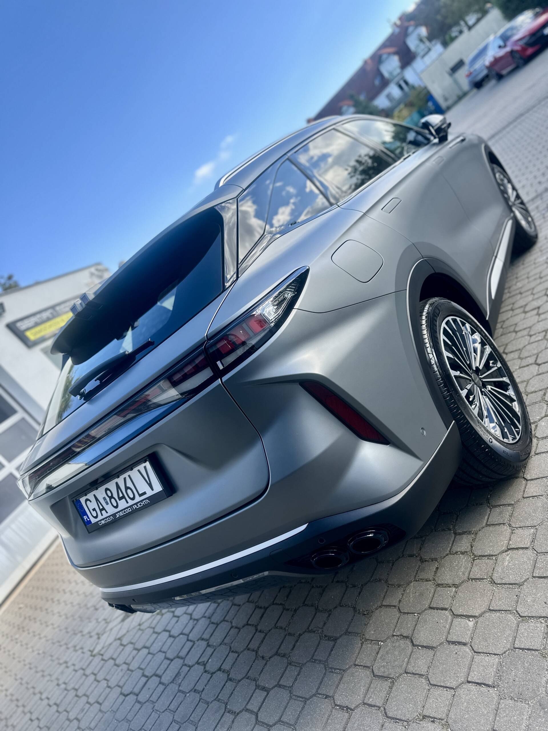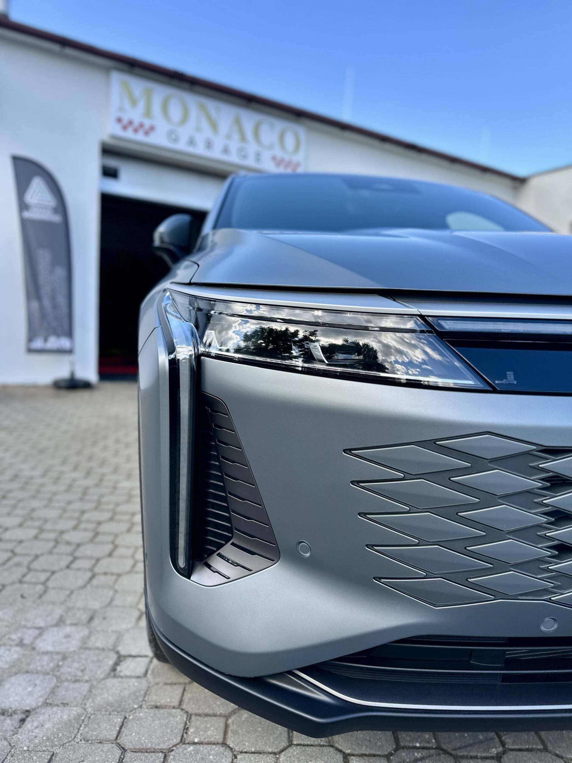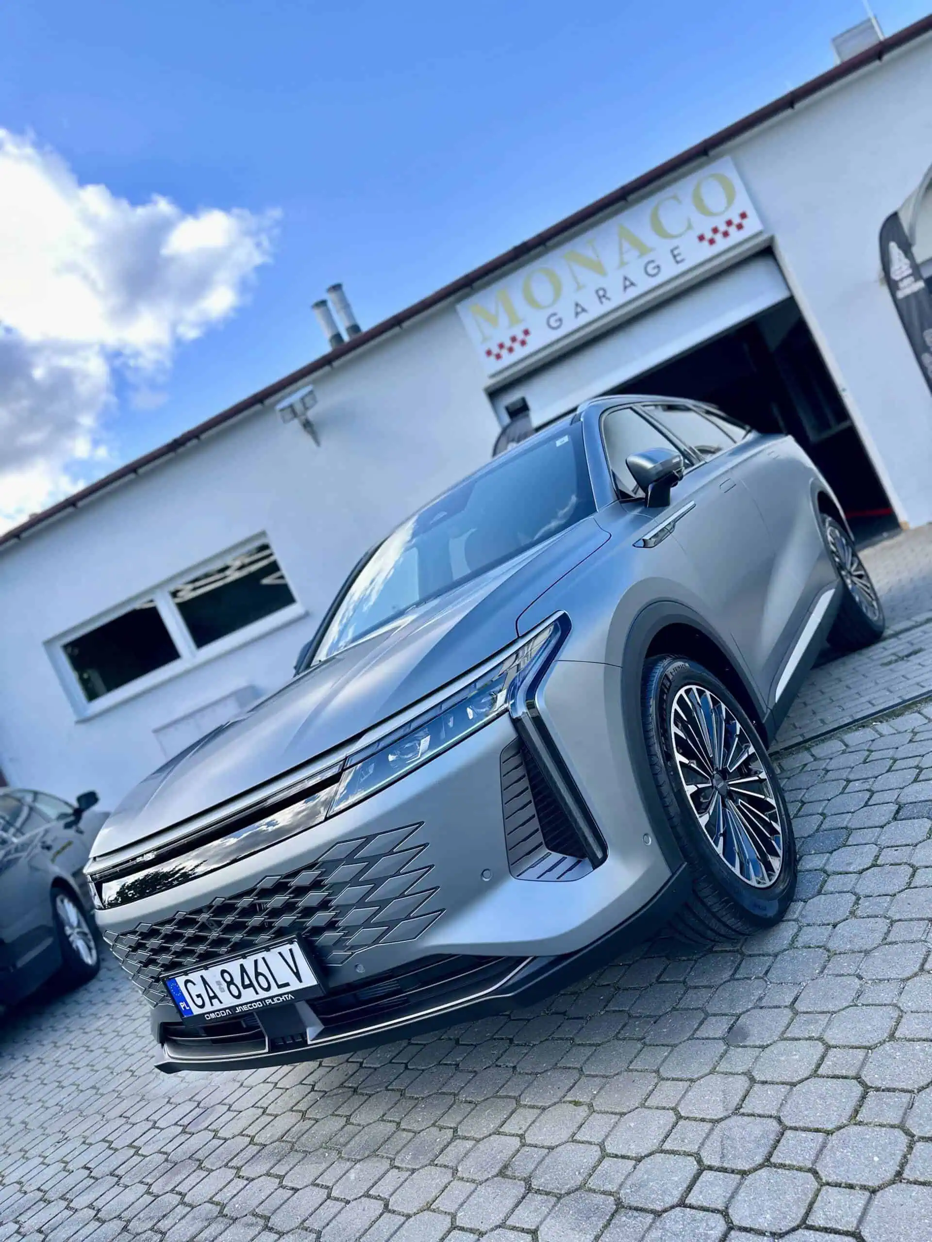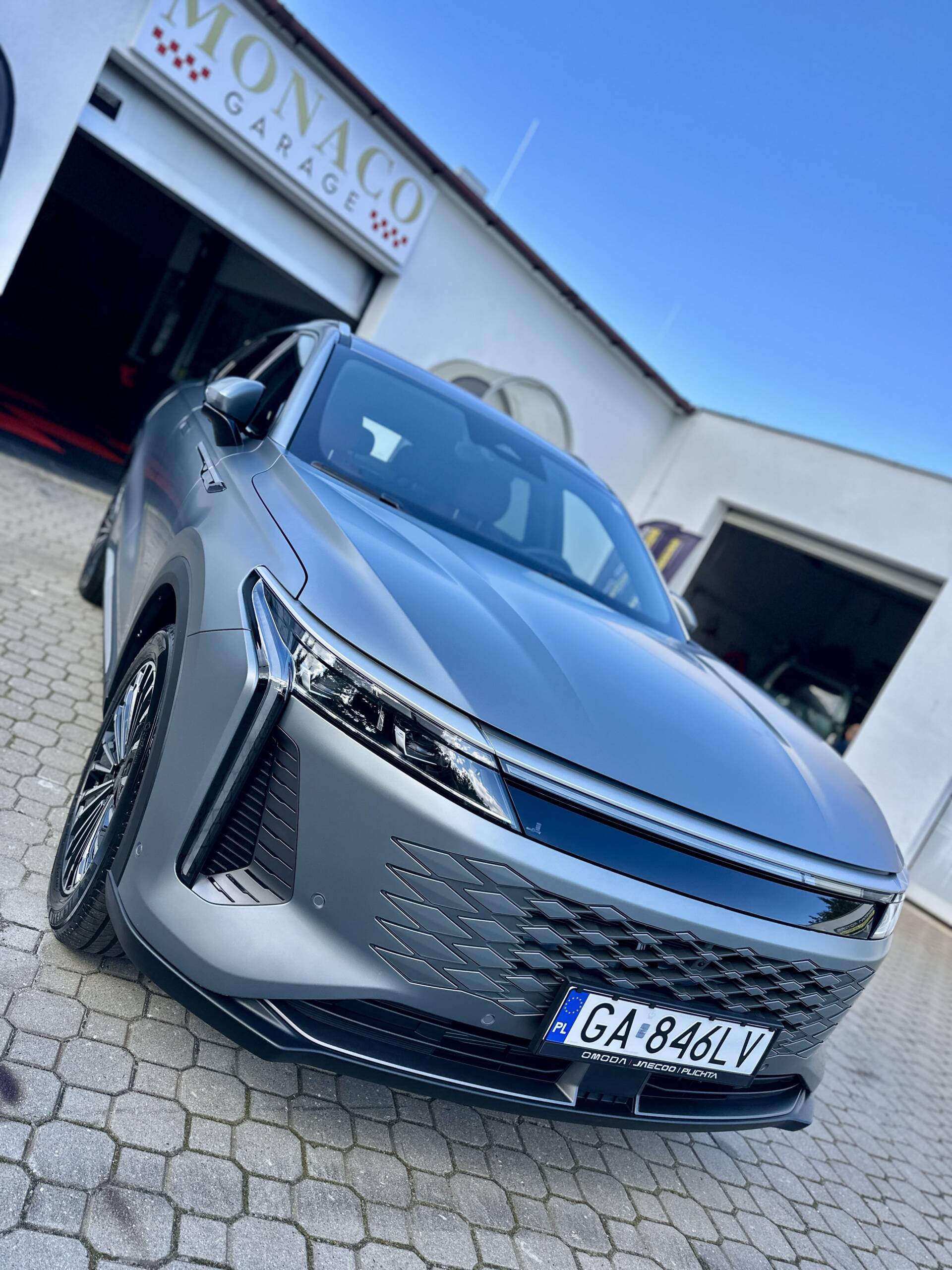 Omoda 9 oklejona w pakiecie Full Body PPF folią Avery w matowym wykończeniu. Oszczędzając na koszcie pojazdu warto zainwestować w jego zabezpieczenie tym bardziej przy tego typu lakierze.