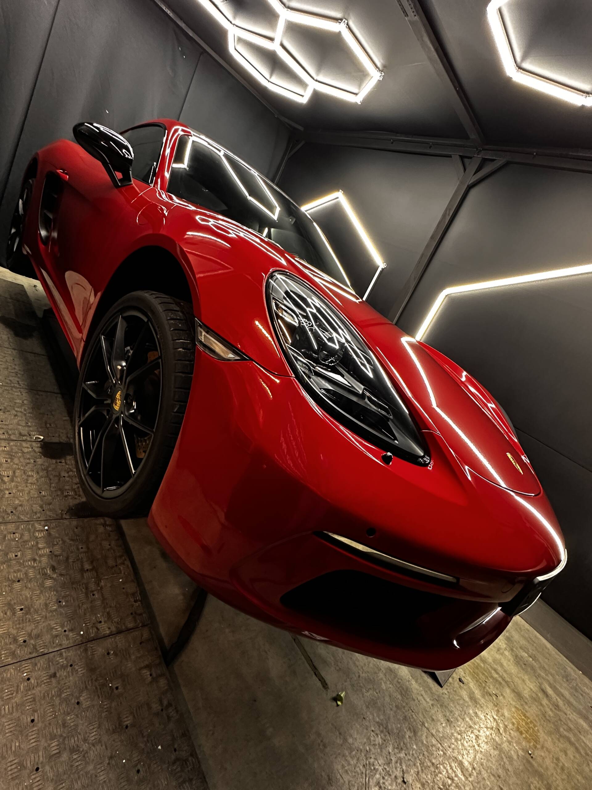 Całkowita zmiana koloru na Vengeance Red z palety KPMF, dach oklejony carbonowym PPF, a na koniec wszystko zabezpieczone powłoką Apollo.