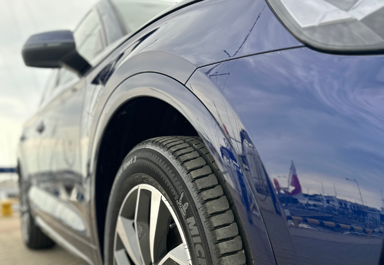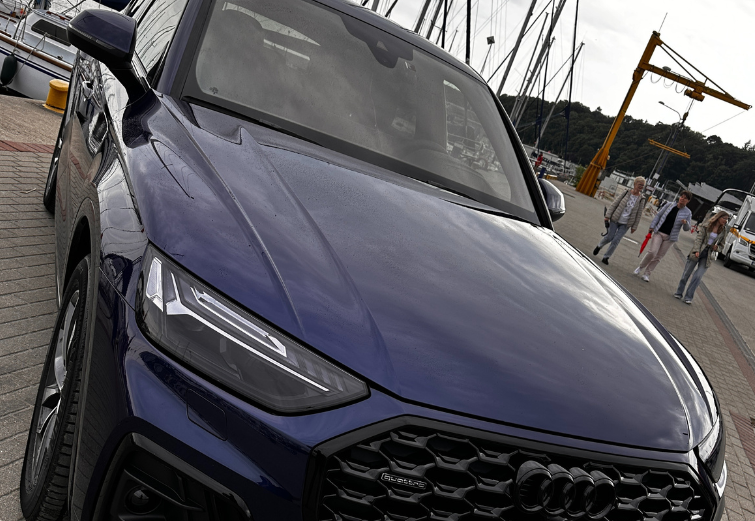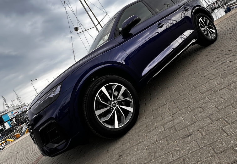 Nowe Audi Q5 i jego lakier w kolorze Navarra Blue zabezpieczona folią PPF w pakiecie Full Body. Folię pokryliśmy powłoką Apollo, dzięki czemu utrzymanie czystości i świeżego wyglądu to bułka z masłem.